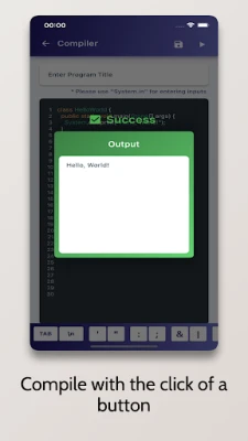 Java Compiler is an Advanced IDE enabling you to compile Java Programs on your Mobile Phone for Free. It comes with a code editor with in-built syntax highlighting capabilities.